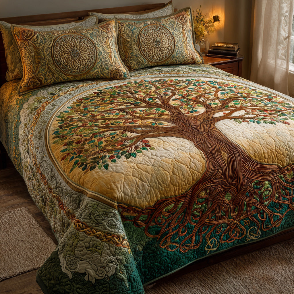 The Emerald Tangle Quilted Bedding Set features a breathtaking Tree of Life design, with deeply rooted, sprawling branches blooming in earthy greens and golden tones. This set merges spiritual symbolism with modern luxury, featuring detailed Celtic knotwork borders and a central mandala motif on the matching shams.