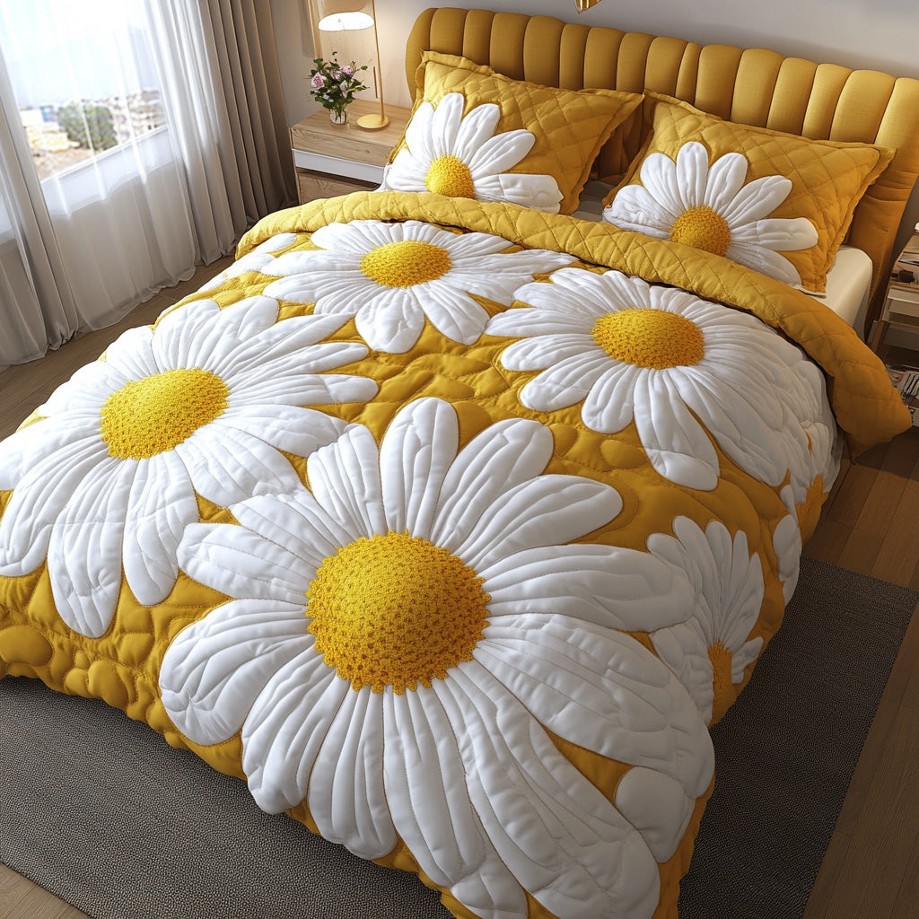 The Golden Hour Daisies Quilted Bedding Set is designed to infuse your sleep space with energy and warmth. The striking artwork features 3D-effect, large white daisies with detailed yellow centers that appear to bloom right off the fabric. Set against a rich, quilted golden-yellow background, this set creates a bold, sun-drenched aesthetic that brightens any master suite or guest room.