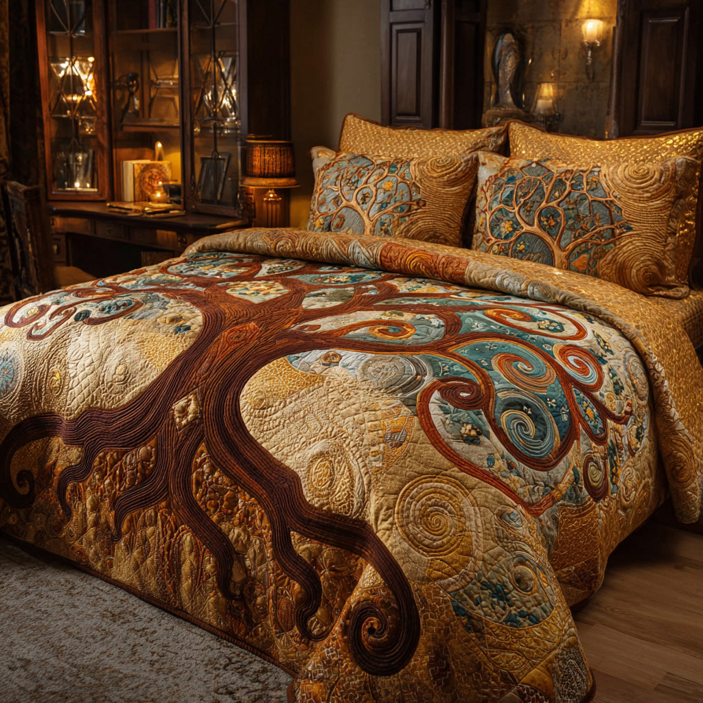 The Golden Whorls Quilted Bedding Set features a mesmerizing Tree of Life centered on a backdrop of radiant gold and amber. The design is defined by its elegant, swirling "whorls"—ornate teal and gold spirals that bloom like celestial fruit from the branches. Grounded by a deep mahogany trunk and fluid, scrolling roots, this set brings a sense of sophisticated, timeless beauty to your home.