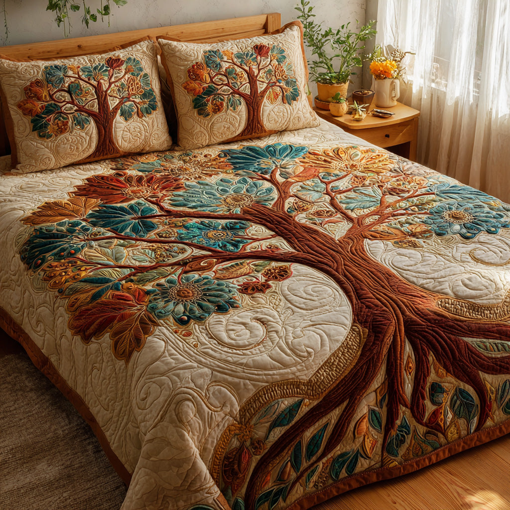 The Sunlit Branches Quilted Bedding Set features a breathtaking Tree of Life motif, blooming with large, stylized flowers in vibrant shades of teal, amber, and burnt orange. Set against a warm cream background with intricate swirling quilt patterns, the design is anchored by a rich mahogany trunk and fluid, graceful roots that symbolize life's deep connections.