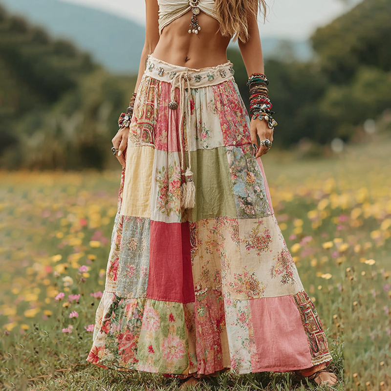 Vintage Boho Floral Patchwork Art Flowy Linen Skirt