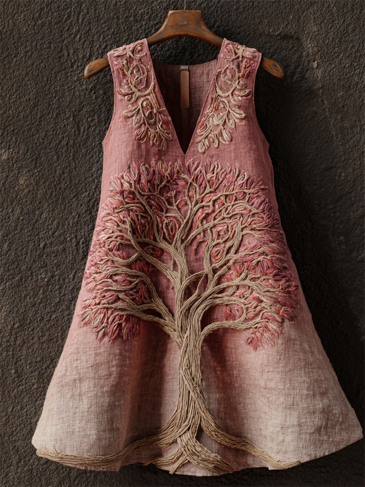 Vintage Pink Tree Of Life Embroidered Gradient Linen Tank Top